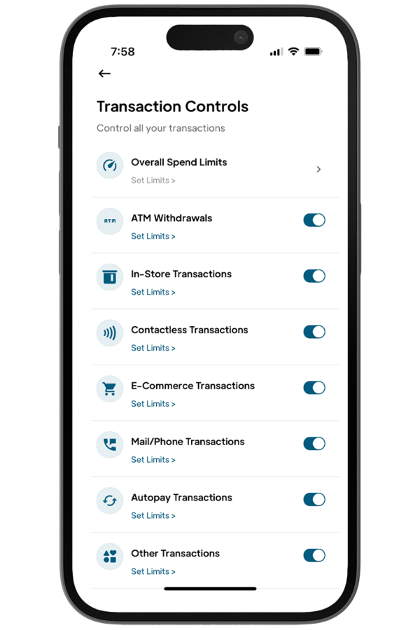 The limits you select will limit the amount you can spend using your debit card for point-of-sale (POS) transactions using the selected card. Any card transaction that exceeds the transaction, daily or monthly limit will be declined and a notification will be sent with the details.
