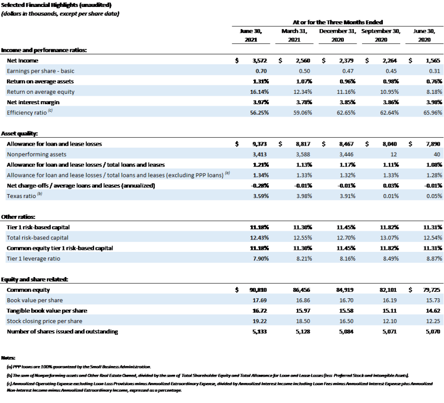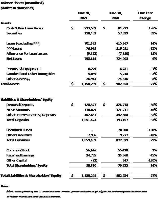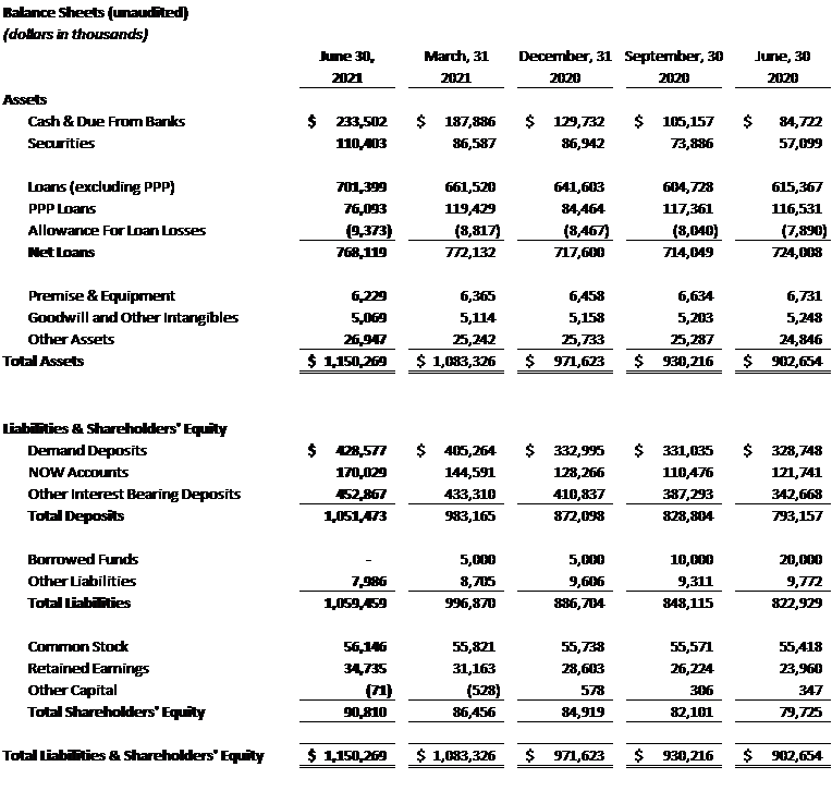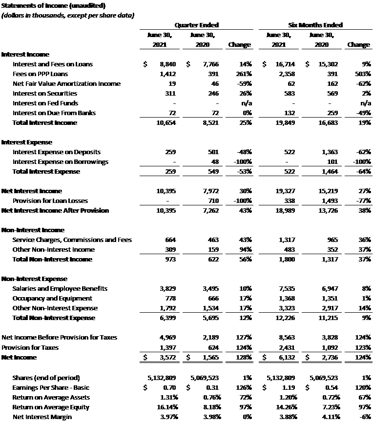 In 2021, the Bank has achieved an annualized return on average assets of 1.20% and return on average equity of 14.26%. Unaudited net income was $3,572,000 ($0.70 per share) for the second quarter ended June 30, 2021, compared to the $1,565,000 ($0.31 per share) earned in the same reporting period in the prior year. Net income in the second quarter of 2021 was positively impacted by a $751,000 loan interest recovery and accelerated recognition of Paycheck Protection Program (PPP) fee income upon loan forgiveness by the Small Business Administration (SBA).
